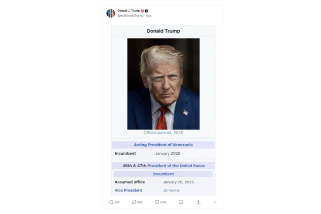 ABD Başkanı Trump, Truth Social hesabında pazartesi sabahı paylaştığı Wikipedia sayfası görünümlü bir görselde kendisini “Venezuela’nın geçici başkanı” olarak tanımlamıştı.